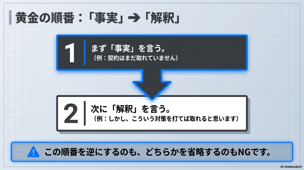 報告の黄金の順番は、まず「事実」を言い、次に「解釈」を言うことです。