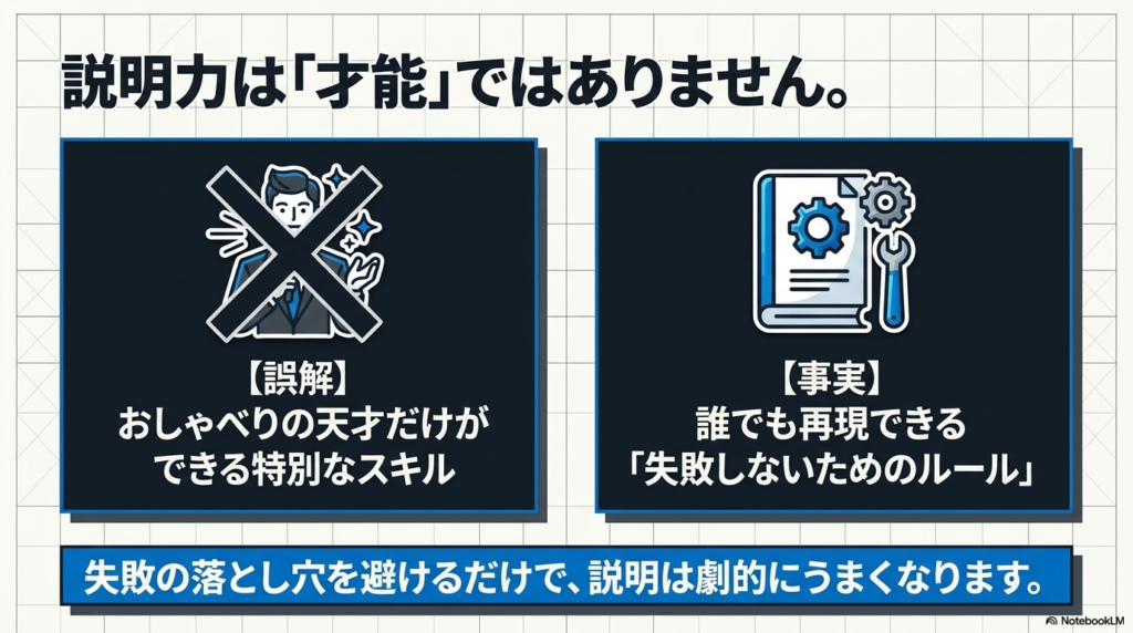 実は、誰でも再現できる「失敗しないための技術(ルール)」さえ知っていれば、落とし穴を避けるだけで劇的に説明がうまくなるのです。