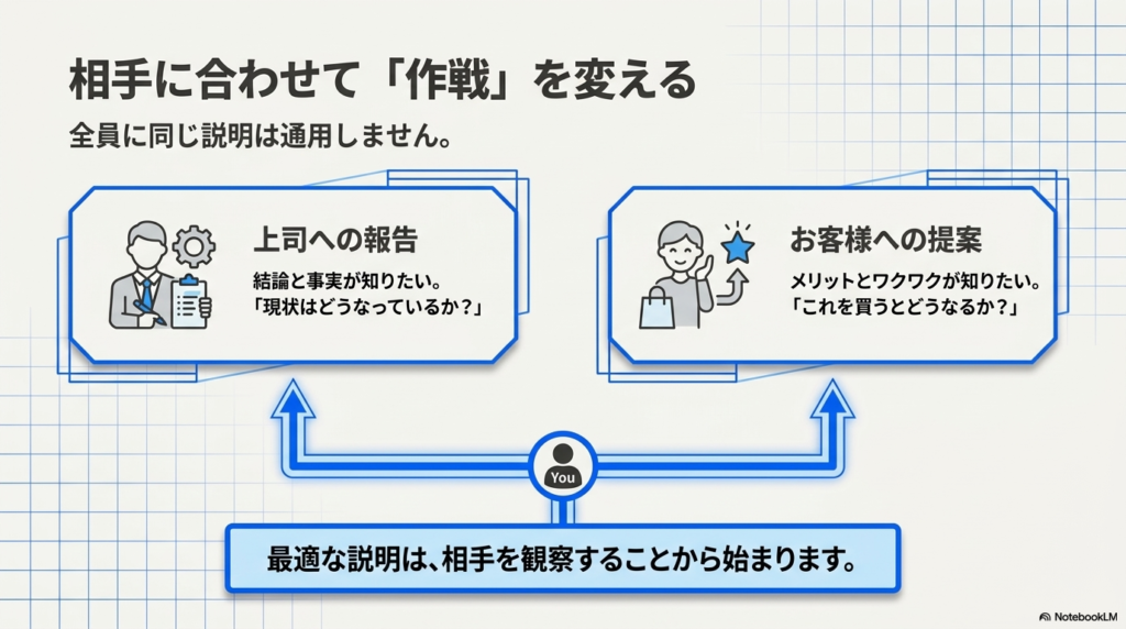 最適な説明は、まず「相手を観察すること」から始まります。