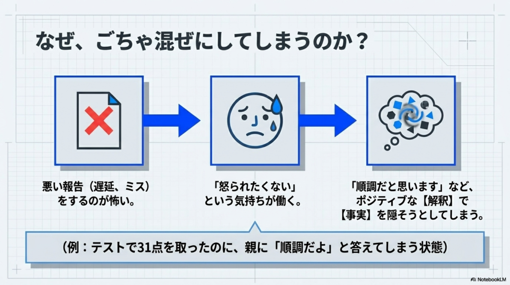 そのため、「順調だと思います」というポジティブな【解釈】の言葉で、ネガティブな【事実】を隠そうとしてしまうのです。