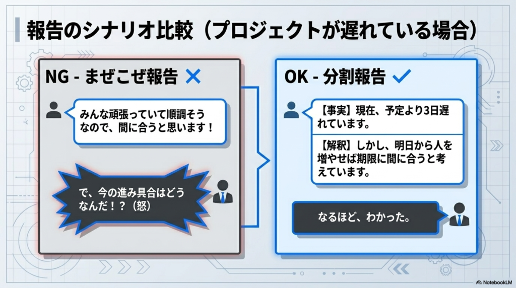 プロジェクトが遅れている場合、ごちゃ混ぜにして「みんな頑張っていて順調そうなので、間に合うと思います!」と伝えると、上司は「で、今の実際の進み具合はどうなんだ!?」とイライラしてしまいます。
