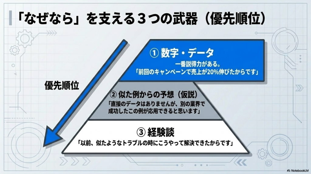 根拠には、説得力に合わせた「優先順位(3つの武器)」があります。