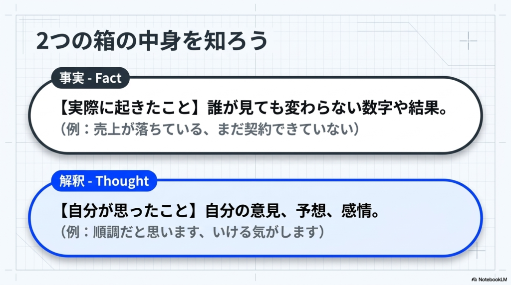 - 事実(Fact): 誰が見ても変わらない数字や結果、実際に起きたこと。(例:作業が予定より3日遅れている、まだ契約できていない)