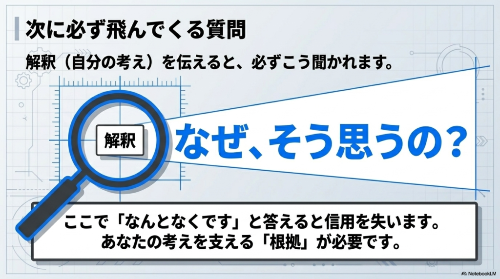 「明日から人を増やせば間に合うと思います」という解釈に対して、「どうしてそう言えるの?」と理由を聞かれたとき、「なんとなくです」「私の勘です」と答えてしまうと、相手からの信用を失ってしまいます。