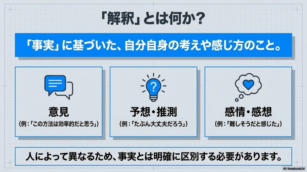 「解釈」とは「事実」に基づいた、自分自身の考えや感じ方のことを指します。